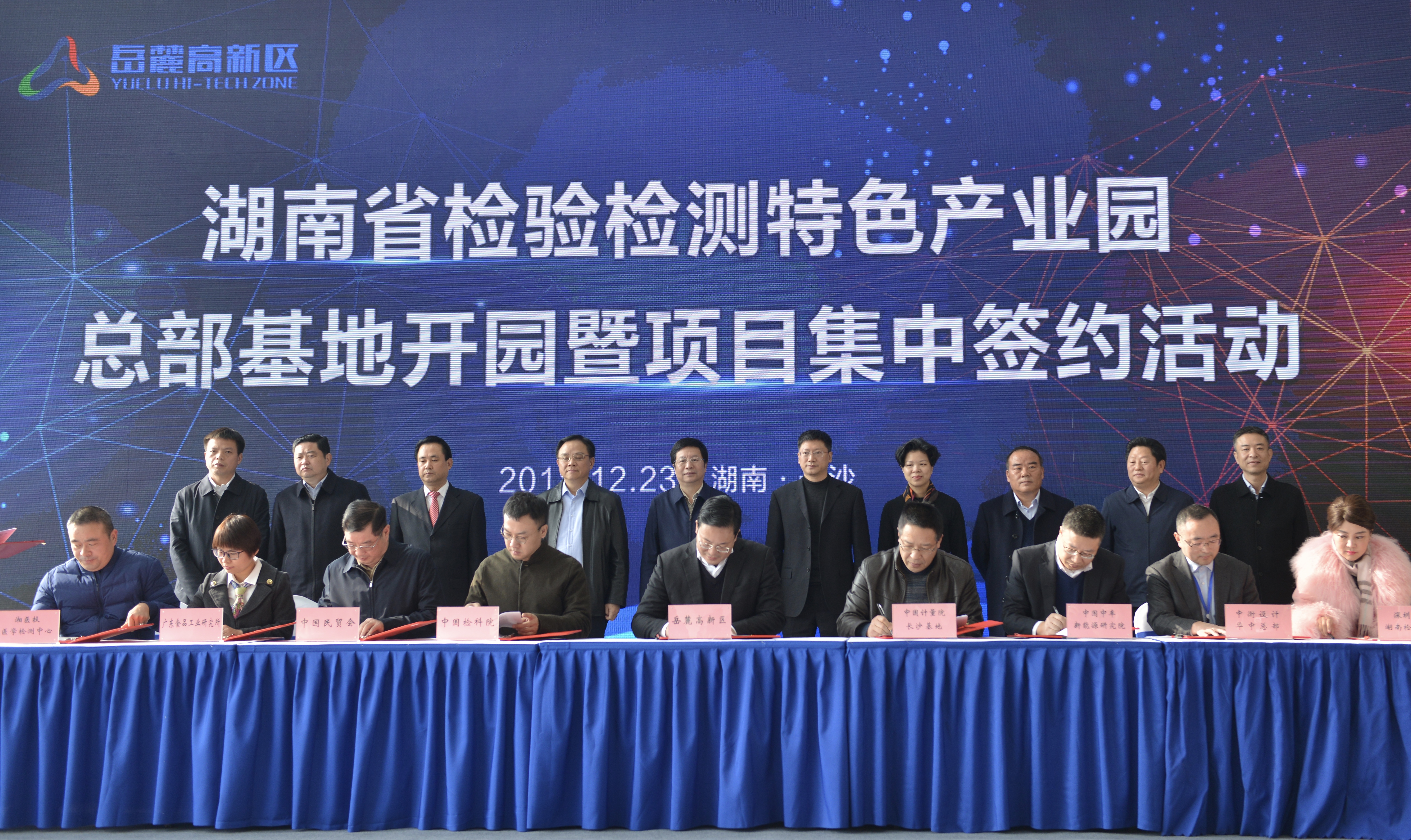 2018年12月23日,湖南省检验检测特色产业园总部基地开园暨项目集中签约活动在长沙举行。省委常委、长沙市委书记胡衡华出席活动并宣布开园。国家市场监督管理总局认可与检验检测监管司副司长乔东宣读“国家检验检测高技术服务业集聚区” 和“国家检验检测认证公共服务平台”批复文件。乔东副司长、向曙光局长共同为园区获批“示范区”“集聚区”授牌。活动现场,中国计量院长沙基地、中国检科院、中车新能源研究院等7大项目集中签约入园。开园仪式结束后,向曙光局长陪同胡衡华书记、乔东副司长实地考察了人和未来、中汽检测、通量检测以及艾科瑞检测等园区企业,听取各企业发展情况汇报。