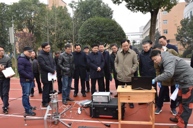 检查组在长沙市砂子塘泰禹小学校园内查看塑胶跑道的各项指标