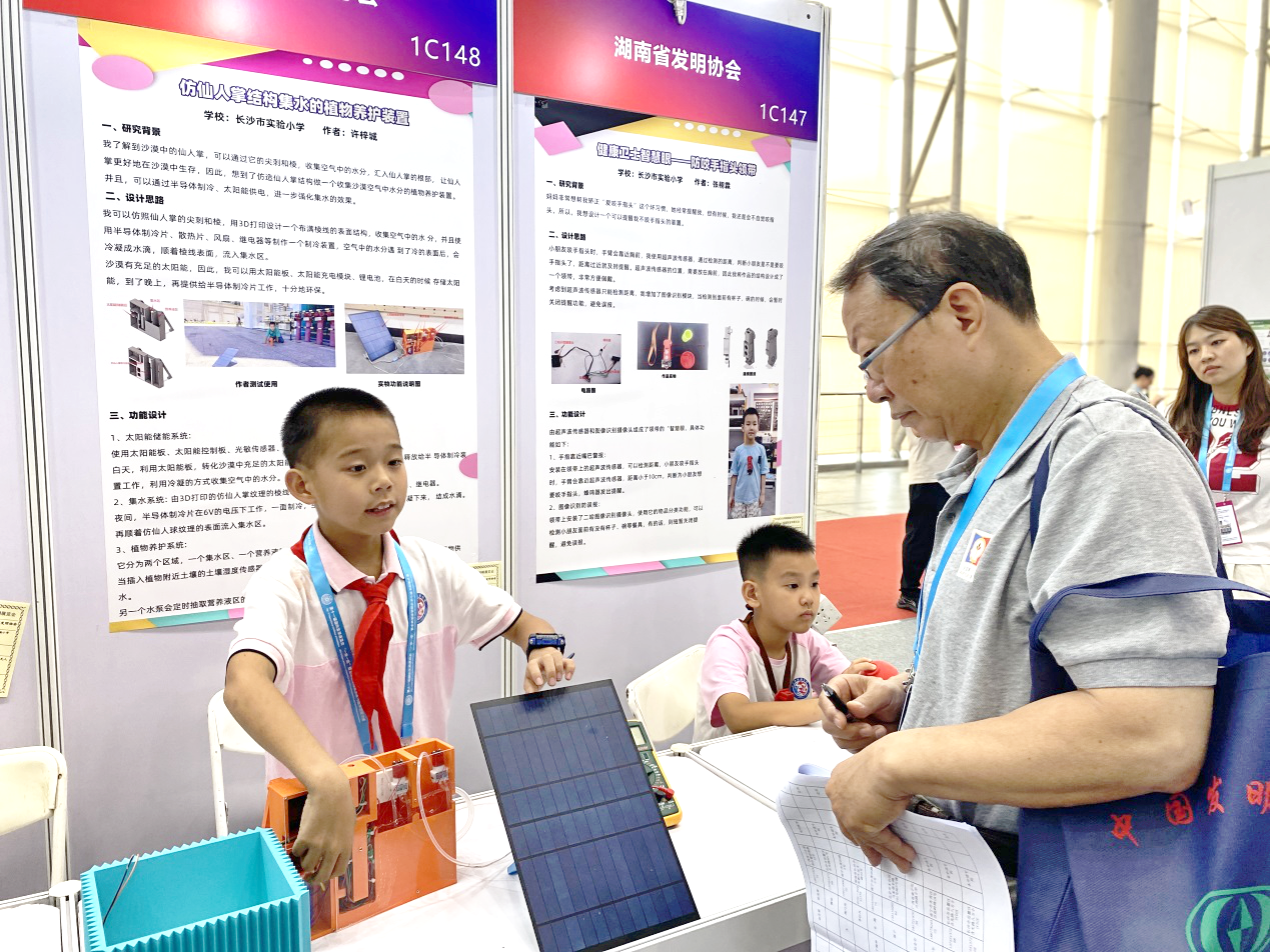 8月24日,为期3天的第十一届国际发明展览会·“一带一路”暨金砖国家技能发展与技术创新大赛在广东省广州市落下帷幕,湖南省代表团携50余项新技术和新发明参展,共获得金奖6项、银奖16项、铜奖16项的优异成绩。湖南省发明协会和长沙市教育科学研究院荣获本届展会最佳组织推荐奖。 长沙市实验小学许梓城同学发明的《沙漠取水天上来——仿仙人掌结构集水的植物养护装置》获得本次展会青少年发明金奖。该作品灵感源于仙人掌通过尖刺和棱高效收集空气中水分的自然机制,装置利用太阳能系统实现日间储能、夜间供电,驱动半导体制冷片在低温环境下冷凝空气中的水汽,并借助3D打印的仿生棱面结构引导水滴汇聚至集水区。同时,装置内置的湿度传感器可实时监测土壤水分,自动触发水泵为植物补水和定时添加营养液,从而实现沙漠环境下的智能植物养护。 长沙麓山国际实验小学贺泂、宁加贝同学发明的《可以清洁与回收粪便的滚筒式智能生态小鸡鸡窝》也获得本次展会青少年发明金奖。该作品是一款集自动清粪、环境调控与生态净化于一体的智能生态鸡窝装置,装置借鉴猫砂盆原理,通过滚筒旋转自动过滤、分离并排出结块鸡粪,有效解决传统养殖中粪便清理难、异味重的问题。同时,系统内置温湿度传感器,可自动触发风扇调节窝内温度,特别是在中心轴位置设计了固定式植物养护区,既隔绝污染,又可自然净化空气,实现健康养殖与生态美观结合。 国际发明展览会是我国发明创新领域最高规格的国际性展会之一,今年的展览会主题为“发明汇湾区,创新联全球”。本届国际发明展览会有来自30多个国家和国际组织的嘉宾参与,展出中外发明成果2000多项,展区总面积约2万平方米,设有新质生产力发展展区、青少年创新展区、“一带一路”国际展区等多个主题展区。(供稿:省发明协会)