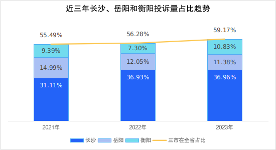 从近三年趋势看,因平台经济的跨区域扩张、人口资本的跨区域流动、市场要素的跨区域配置,长沙、岳阳、衡阳3个市的消费正在加速集聚。消费投诉数量与消费活跃水平呈正相关关系,3市投诉举报总量在全省的占比从2021年的55.49%增长到2023年的59.17%,消费投诉的加速集聚在一定程度上反映了消费供给侧发展的不平衡,恢复和扩大消费需注重协同、平衡和高质量发展。