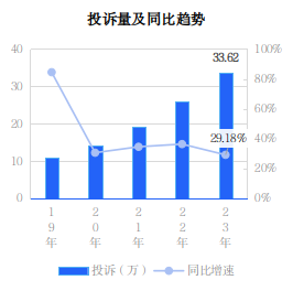 2023年,全省市场监管部门共受理消费者投诉33.62万件,同比增长29.18%。从投诉问题看,食品安全6.90万件、售后服务5.83万件、质量4.66万件、合同3.79万件、不正当竞争3.58万件,合计占比73.64%。其中,不正当竞争问题增长最快,同比增长334.65%。
