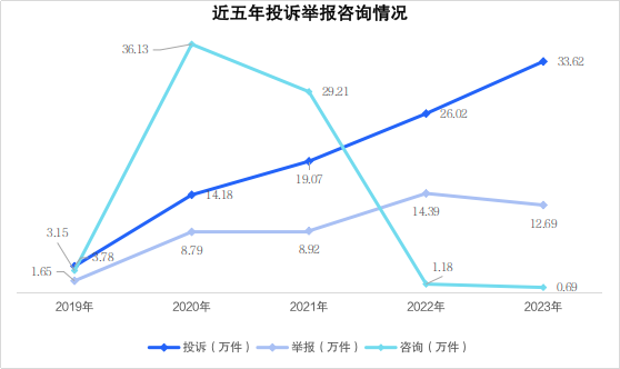 2023年,全省市场监管部门通过12315平台共受理消费者投诉、举报和咨询46.99万件,同比增长12.98%。投诉、举报按时办结率分别为99.03%、99.80%,为消费者挽回经济损失1.05亿元,同比增长13.89%,有力维护了消费者合法权益,为优化消费环境、提振消费信心发挥了重要积极作用。分析2023年全省12315平台受理投诉举报,主要呈现十大特点:
