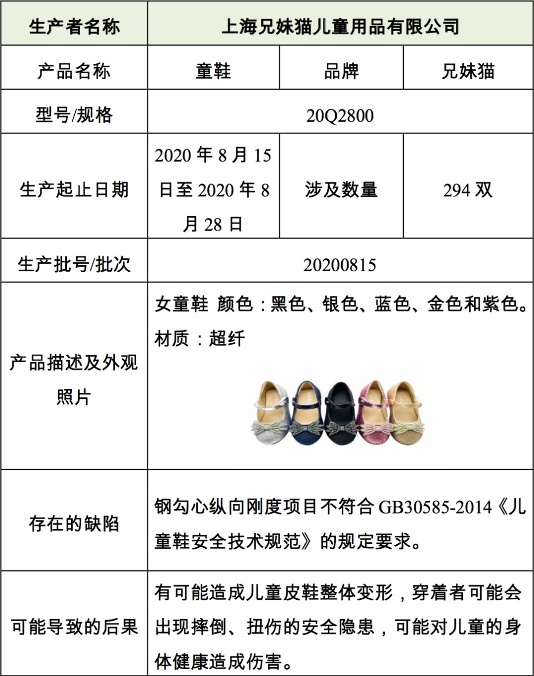 上海兄妹猫儿童用品有限公司召回294双“兄妹猫”童鞋