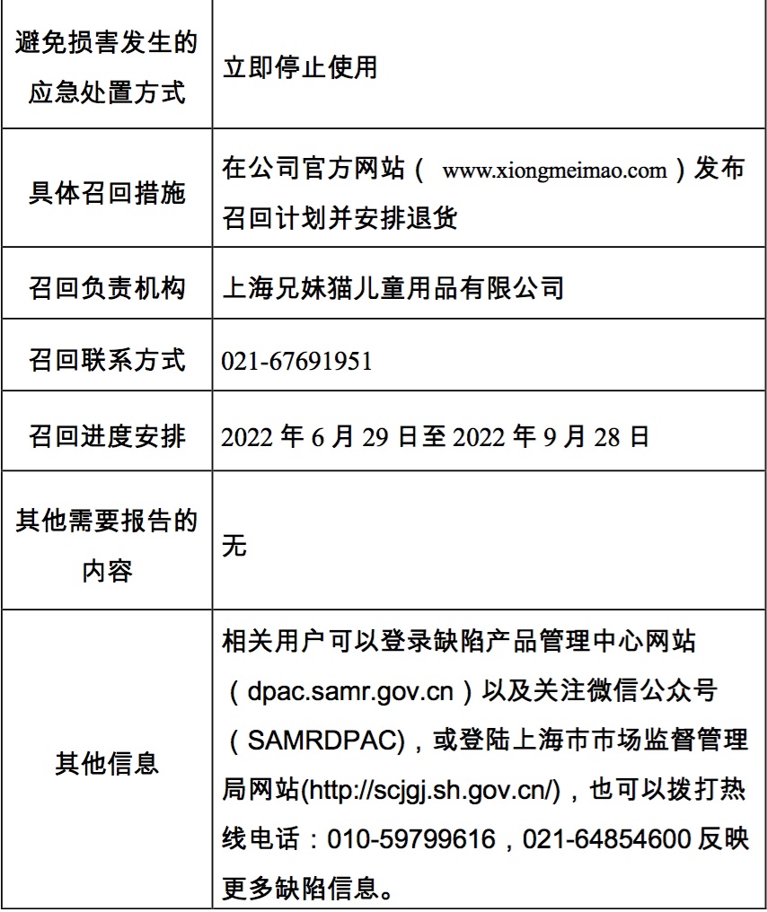 上海兄妹猫儿童用品有限公司于2022年6月29日至2022年9月28日召回2020年8月15日至2020年8月28日期间生产的型号为20Q2800、生产批号为20200815的“兄妹猫”童鞋,涉及294双。 召回原因 钢勾心纵向刚度项目不符合GB 30585-2014《儿童鞋安全技术规范》的规定要求。有可能造成儿童皮鞋整体变形,穿着者可能会出现摔倒、扭伤的安全隐患,可能对儿童的身体健康造成伤害。 解决办法 请消费者立即停止使用该产品,上海兄妹猫儿童用品有限公司将在官方网站(www.xiongmeimao.com)发布召回计划并安排退货。