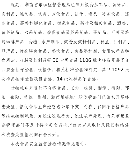 湖南省市场监督管理局关于1106批次食品安全抽样检验情况的通告(2026年第3期)