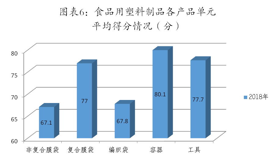 从图表5、6可看出,被检查的企业中,电热食品加工设备及餐具洗涤剂生产企业质量安全控制水平整体较好,食品用塑料包装容器工具等制品生产企业相对较差;特别是食品用非复合膜袋和编织袋生产企业情况较差。