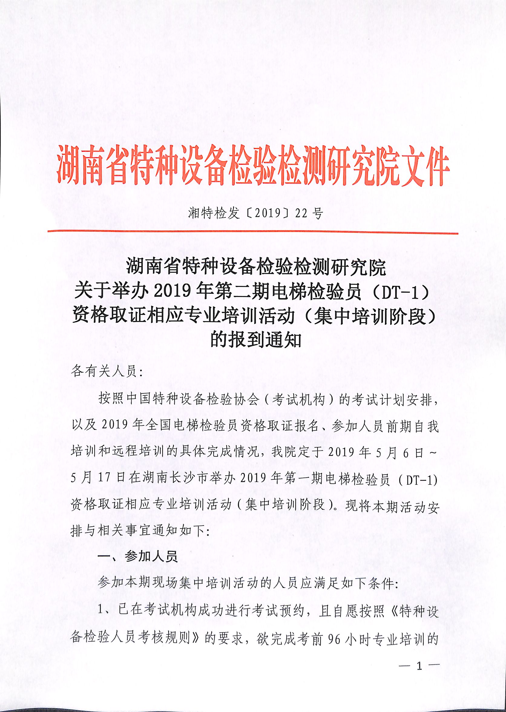 - 名称: 湖南省特种设备检验检测研究院关于举办2019年第二期电梯检验员(DT-1)资格取证相应专业培训活动(集中培训阶段)的报到通知