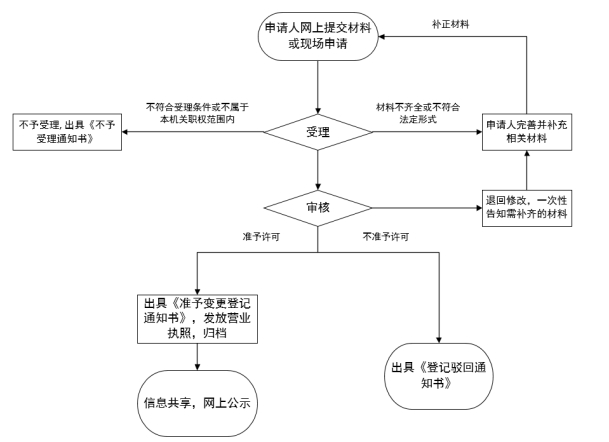 我要办企业变更登记办事指南 一、 事项名称:我要办企业变更登记 二、 办理依据 1.《中华人民共和国公司法》; 2.《中华人民共和国公司登记管理条例》; 3.《中华人民共和国合伙企业法》; 4.《中华人民共和国合伙企业登记管理办法》; 5.《中华人民共和国个人独资企业法》; 6.《个人独资企业登记管理办法》; 7.《中华人民共和国外资企业法》; 8.《中华人民共和国中外合资经营企业法》; 9.《中华人民共和国中外合作经营企业法》; 10.《中华人民共和国行政许可法》; 11.《中华人民共和国企业法人登记管理条例》; 12.《中华人民共和国企业法人登记管理条例施行细则》; 13.《企业登记程序规定》; 14.《外商投资准入特别管理措施(负面清单)(2018年版)》; 15.《市场监管总局关于印发<企业登记申请文书规范><企业登记提交材料规范>的通知》; 16.《湖南省人民政府办公厅关于推进“多证合一”改革的实施意见》。 三、 办理条件 申请企业为已在湖南省市场监督管理局办理登记的有限公司(股份有限公司)、非公司制企业及其分支机构、个人独资企业及其分支机构、合伙企业及其分支机构、外商投资企业及其分支机构、外商投资合伙企业及分支机构。 四、 申请方式 (一)网上申请方式:申请人登录湖南政务服务网(http://zwfw-new.hunan.gov.cn/)-“部门服务”-“省市场监督管理局”相应服务事项栏目“在线办理”申请办理。 (二)现场申请方式:申请人携带申请资料前往湖南省市场监督管理局办事大厅现场办理。 五、 申请材料 公司变更登记提交材料规范 1.《公司登记(备案)申请书》。 2.关于修改公司章程的决议、决定(变更登记事项涉及公司章程修改的,提交该文件;其中股东变更登记无须提交该文件,公司章程另有规定的,从其规定)。 ◆ 有限责任公司提交由代表三分之二以上表决权的股东签署的股东会决议。 ◆ 股份有限公司提交由会议主持人及出席会议的董事签署的股东大会会议记录。 ◆ 一人有限责任公司提交股东签署的书面决定。 ◆ 国有独资公司提交国务院、地方人民政府或者其授权的本级人民政府国有资产监督管理机构的批准文件复印件。 3.修改后的公司章程或者公司章程修正案(公司法定代表人签字)。 4.变更事项相关证明文件。 ◆ 变更名称的,应当向其登记机关提出申请。申请名称超出登记机关管辖权限的,由登记机关向有该名称核准权的上级登记机关申报。 ◆ 变更住所的,提交变更后住所的使用证明。 ◆ 变更法定代表人的,根据公司章程的规定提交原任法定代表人的免职证明和新任法定代表人的任职证明(股东会决议、股东决定由股东签署,董事会决议由公司董事签字);公司法定代表人更改姓名的,提交公安部门出具的证明。 ◆ 减少注册资本的, 提交在报纸上刊登公司减少注册资本公告样报和公司债务清偿或者债务担保情况的说明。应当自公告之日起45日后申请变更登记。 ◆ 变更经营范围的,公司申请登记的经营范围中有法律、行政法规和国务院决定规定必须在登记前报经批准的项目,提交有关批准文件或者许可证件的复印件。审批机关单独批准分公司经营许可经营项目的,公司可以凭分公司的许可经营项目的批准文件、证件申请增加相应经营范围,但应当在申请增加的经营范围后标注“(限分支机构经营)”字样。 ◆ 变更股东的,股东向其他股东转让全部股权的,提交股东双方签署的股权转让协议或者股权交割证明。股东向股东以外的人转让股权的,提交其他股东过半数同意的文件;其他股东接到通知三十日未答复的,提交拟转让股东就转让事宜发给其他股东的书面通知;股东双方签署的股权转让协议或者股权交割证明;新股东的主体资格证明或自然人身份证件复印件。 公司章程对股权转让另有规定的,从其规定。 人民法院依法判决、裁定划转股权的,应当提交人民法院的判决书或裁定书,无须提交股东双方签署的股权转让协议或者股权交割证明和其他股东过半数同意的文件;国务院、地方人民政府或者其授权的本级人民政府国有资产监督管理机构划转国有资产相关股权的,提交国务院、地方人民政府或者其授权的本级人民政府国有资产监督管理机构关于划转股权的文件,无须提交股东双方签署的股权转让协议或者股权交割证明。 ◆ 变更股东或发起人名称或姓名的,提交股东或发起人名称或姓名变更证明;股东或发起人更名后新的主体资格证明或者自然人身份证件复印件。 ◆ 以上各项涉及其他登记事项变更的,应当同时申请变更登记,按相应的提交材料规范提交相应的材料。 5.法律、行政法规和国务院决定规定公司变更事项必须报经批准的,提交有关的批准文件或者许可证件复印件。 6.已领取纸质版营业执照的缴回营业执照正、副本。 注: 1.依照《公司法》、《公司登记管理条例》设立的公司申请变更登记适用本规范。 2. 人民法院要求办理有限责任公司股东变更登记的,执行人员应当出示工作证或者执行公务证,送达生效法律文书副本或者执行裁定书、协助执行通知书、协助公示执行信息需求书、合法受让人的身份或资格证明,到被执行人股权所在有限责任公司登记的登记机关办理。 3.股份有限公司无需进行股东变更登记。 分公司变更登记提交材料规范 1.《分公司、非法人分支机构、营业单位登记(备案)申请书